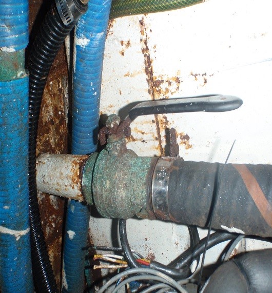 The hydraulic steering system looked in good condition, with an excellent emergency steering system in place. There is three built in 250 litre steel diesel tanks. One tank is in the keel and then one either side of the motor. There is a 150 litre plastic water tank and a 50 litre water bladder under the saloon floor. There is a 100 litre grey water tank. The hydraulic steering looked in very good condition, the fittings and ram looked like new. All the sea cocks turned on and off easily. Clearly visible is the rusty hull!